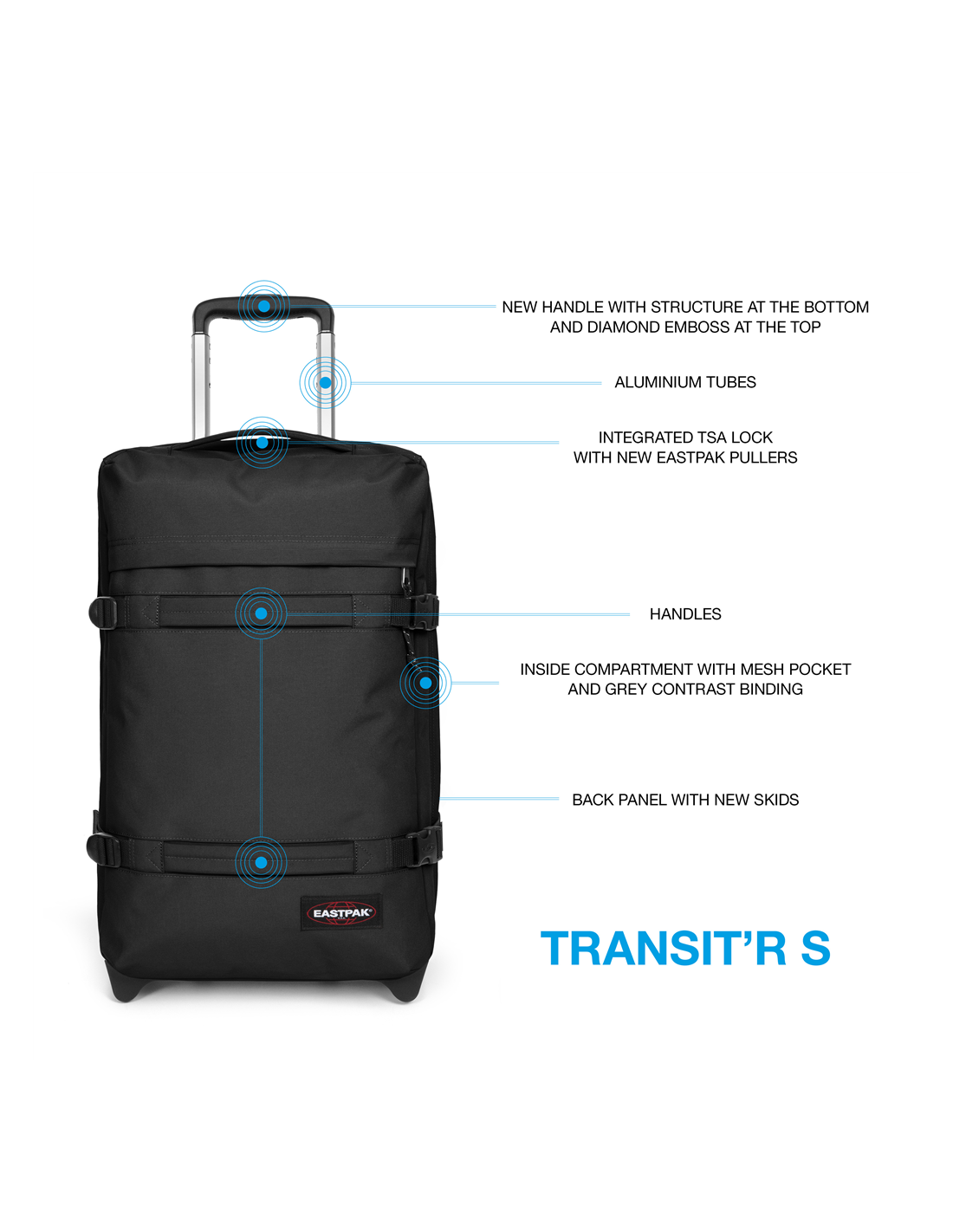 -Poignée télescopique, poignée supérieure et deux poignées de transport avant
