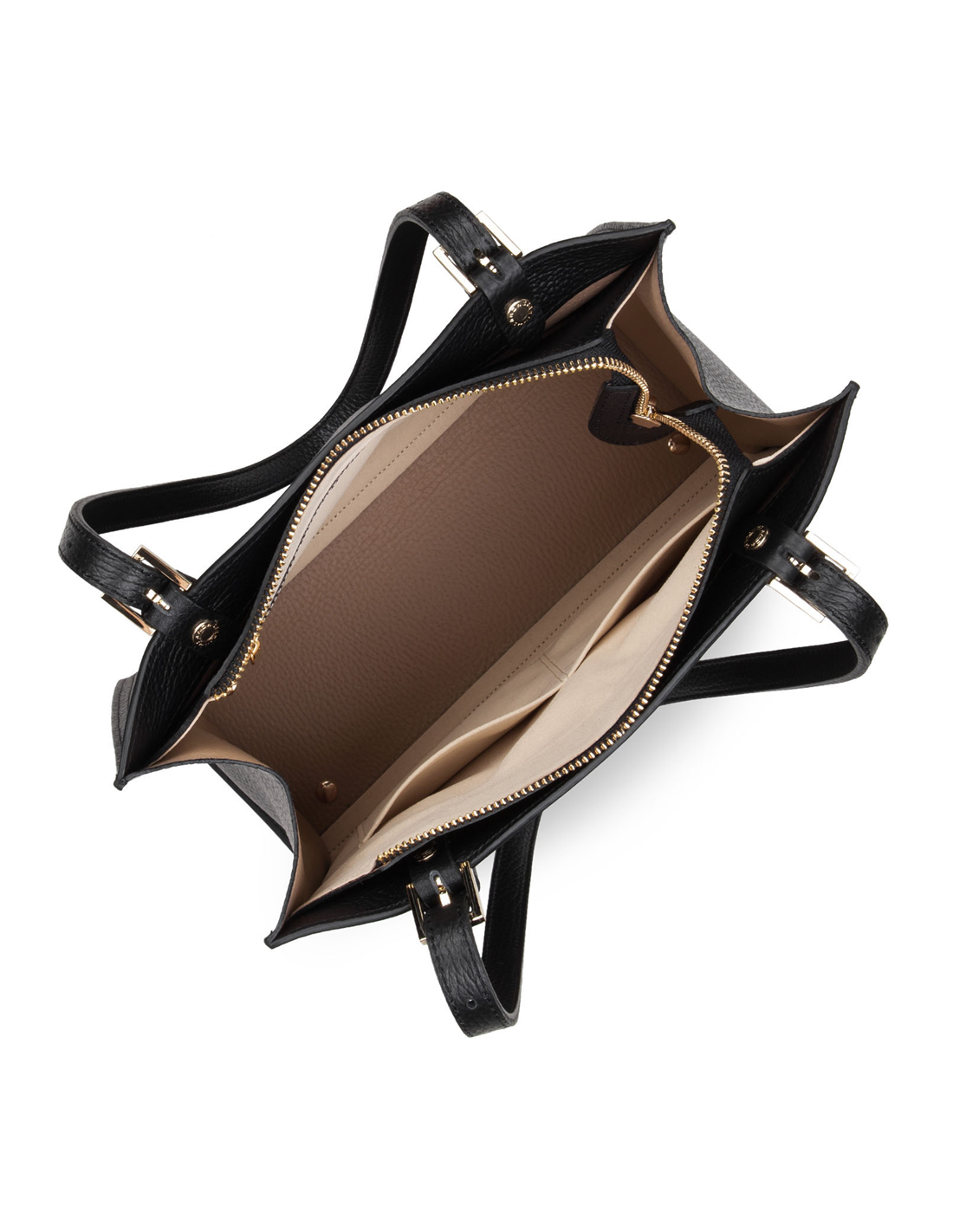 Poche frontale zippée, poche intérieure zippée, compartiment central zippé, poche intérieure simple.